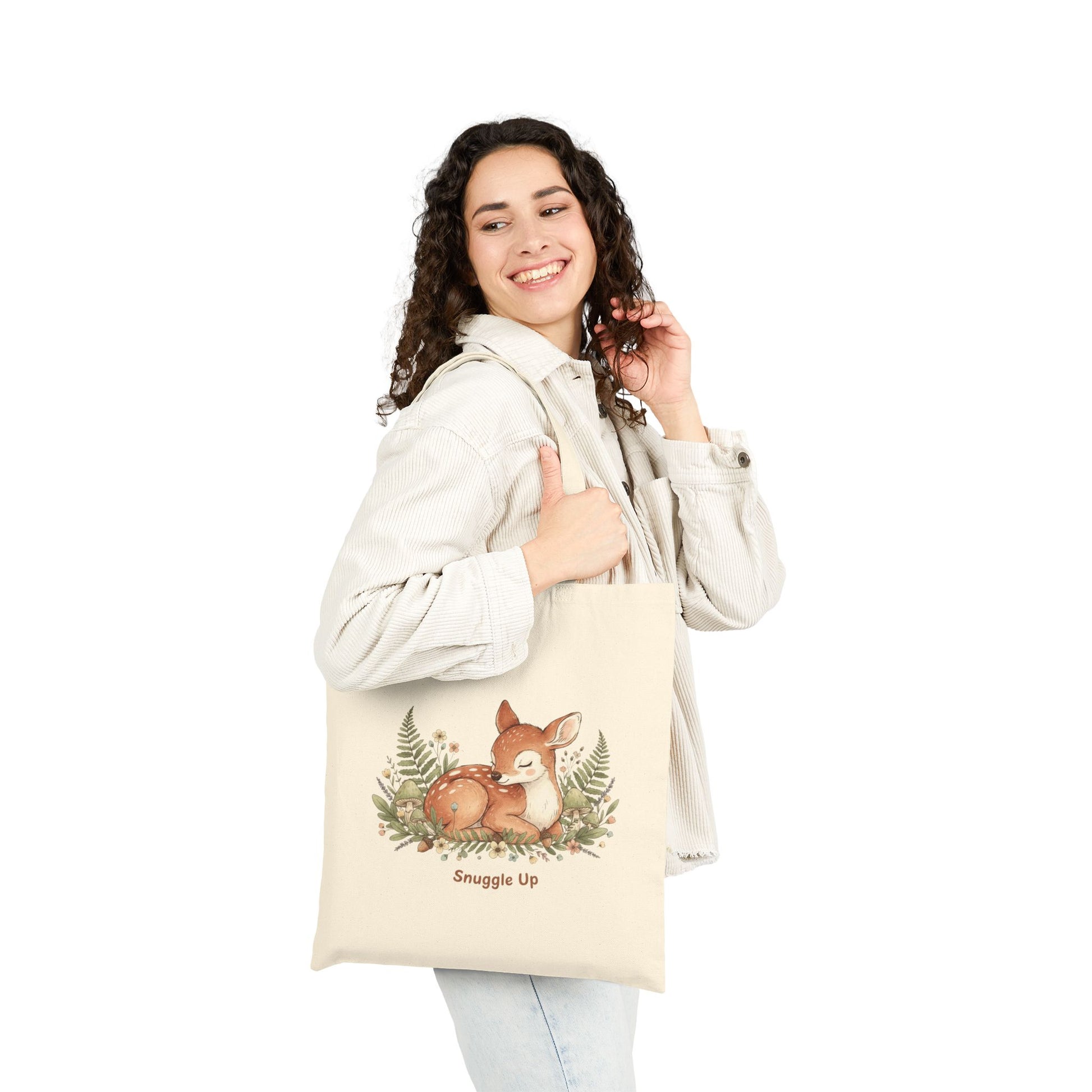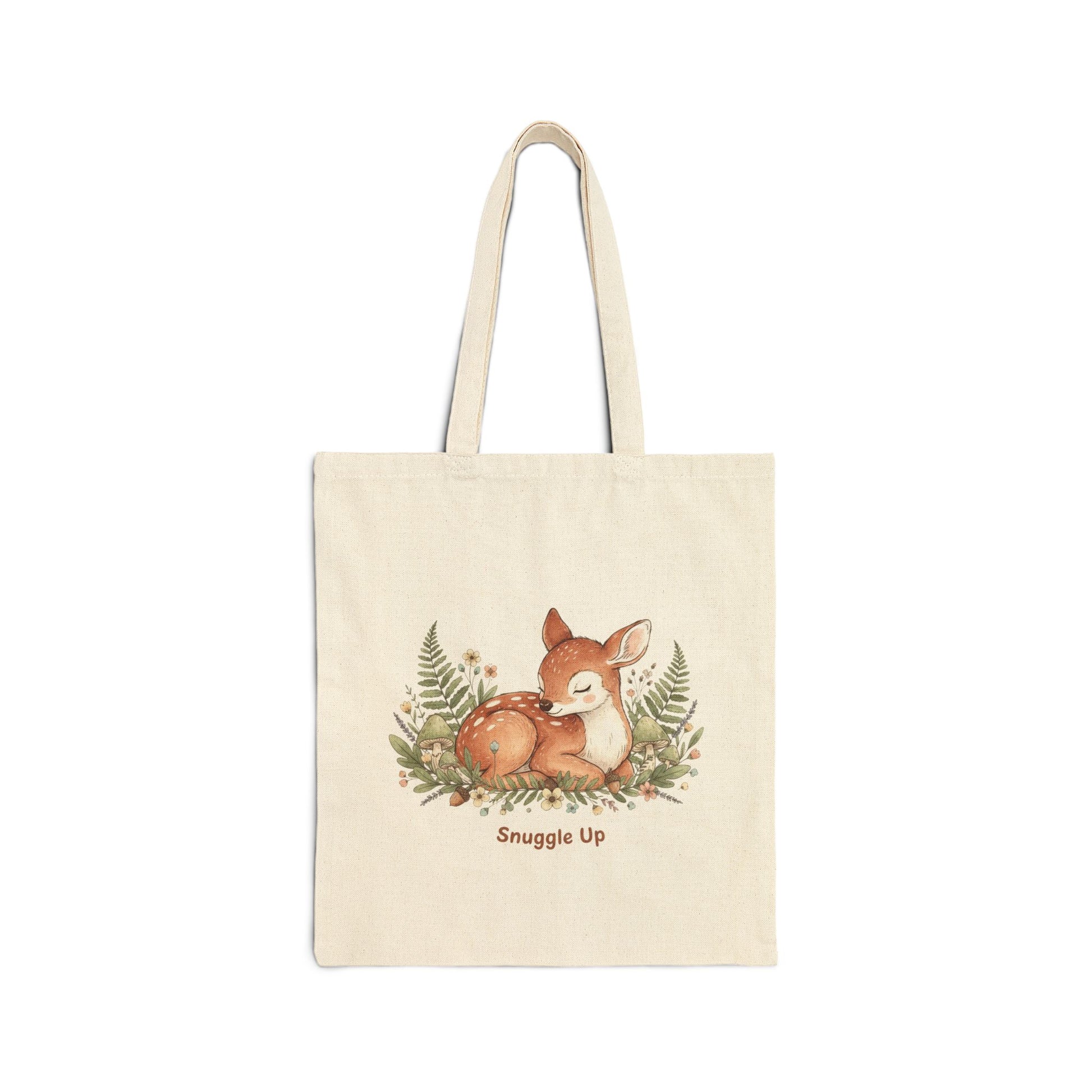 A soft, gift idea, slow-living cotton tote printed with a warm, watercolour-style winter fox curled among evergreen sprigs. The illustration leans into the Cute Cozy Critter Art trend with muted rusts, creams, and forest-green accents, creating a gentle, homespun mood that reads like a small wearable art piece. Subtle composition and minimal text let the cozy animal scene carry the emotion—suitable for everyday errands, a trendy market runs, or layering into a winter wardrobe that favors comforting, nature-inspired details. Product features - 100% cotton canvas - Heavy fabric (12 oz/yd², 406.9 g/m²) - Flat corners (no gusset) - Self-fabric carrying handles with reinforced stitching - Available in natural and black; sewn-in label; sourced from India Care instructions - Do not iron directly over the printed area - print may stick to the iron. - Spot clean - Do not bleach - Line dry